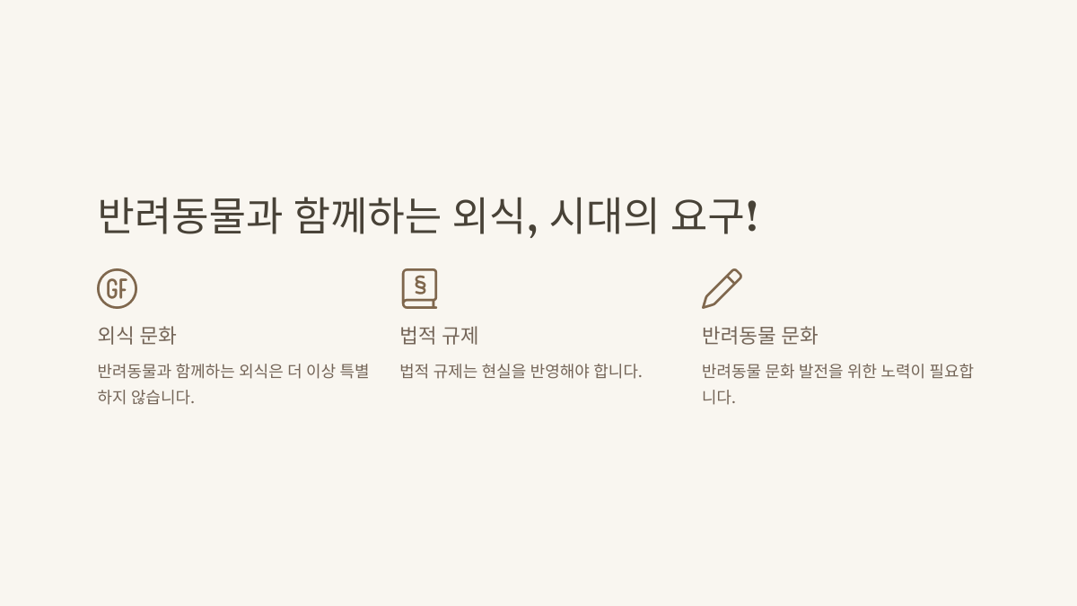 반려동물과 함께하는 외식은 더 이상 특별한 일이 아닙니다. 그러나 법적 규제와 시범사업 참여율 저조 등의 문제로 반려인들은 아직 많은 제약을 받고 있습니다. 법령 개정을 통해 이러한 문제를 해결하고, 반려동물 문화가 더욱 발전할 수 있는 기반을 마련해야 합니다.